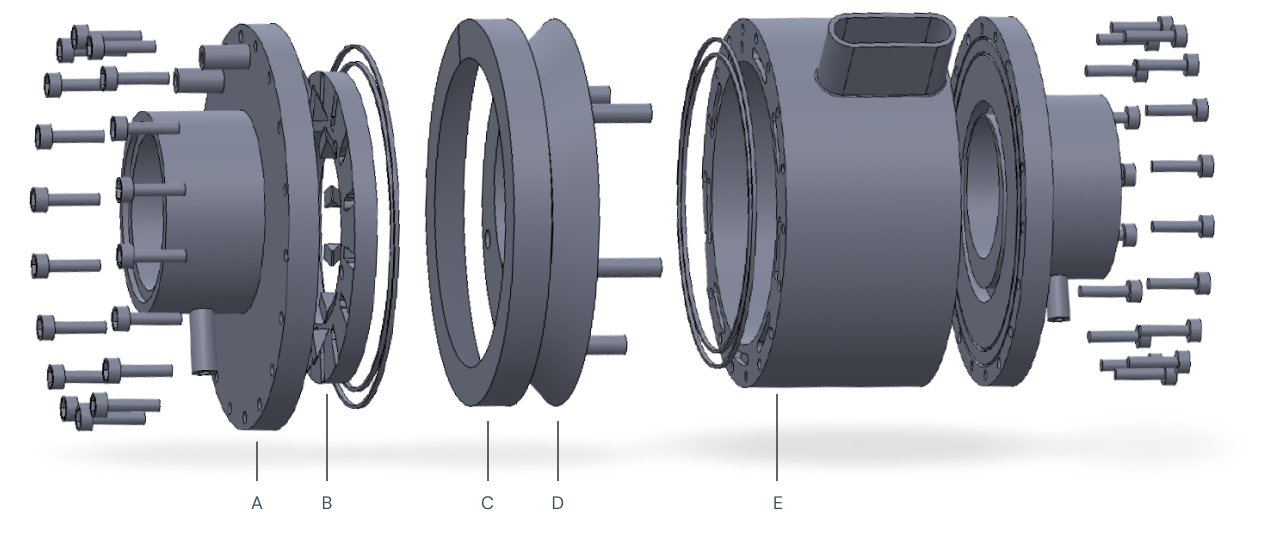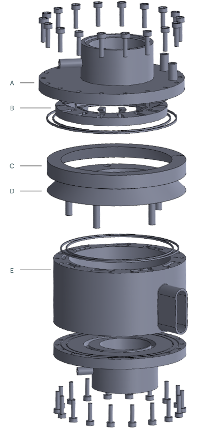 The housing plate D is elastically biased against a fixed outer plate A using intermediate elements B and C. This multi-layer design allows more of the energy released from the combustion process to be captured, increasing the total combustion efficiency.