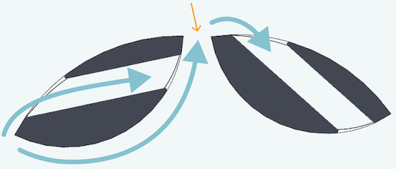 Water is forced between electrode wings where electrolysis is concentrated to a narrow gap